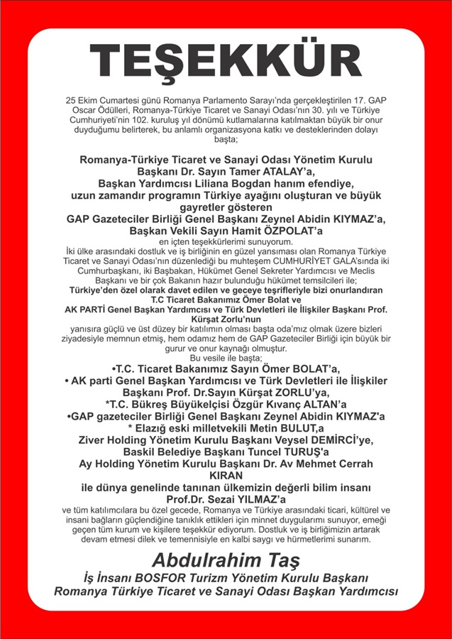 “Bu anlamlı organizasyona katkı ve desteklerinden dolayı başta Romanya-Türkiye Ticaret ve Sanayi Odası Yönetim Kurulu Başkanı Dr. Tamer ATALAY’a, Başkan Yardımcısı Liliana Bogdan hanımefendiye, uzun süredir programın Türkiye ayağını oluşturan ve büyük gayretler gösteren GAP Gazeteciler Birliği Genel Başkanı Zeynel Abidin KIYMAZ’a ve Başkan Vekili Hamit ÖZPOLAT’a en içten teşekkürlerimi sunuyorum.”