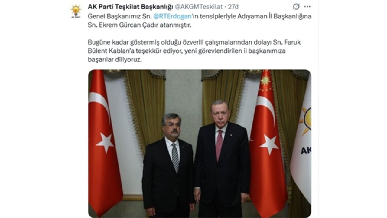 “Genel Başkanımız Sn. @RTErdogan’ın tensipleriyle Adıyaman İl Başkanlığına Sn. Ekrem Gürcan Çadır atanmıştır. Bugüne kadar göstermiş olduğu özverili çalışmalarından dolayı Sn. Faruk Bülent Kablan’a teşekkür ediyor, yeni görevlendirilen il başkanımıza başarılar diliyoruz.”