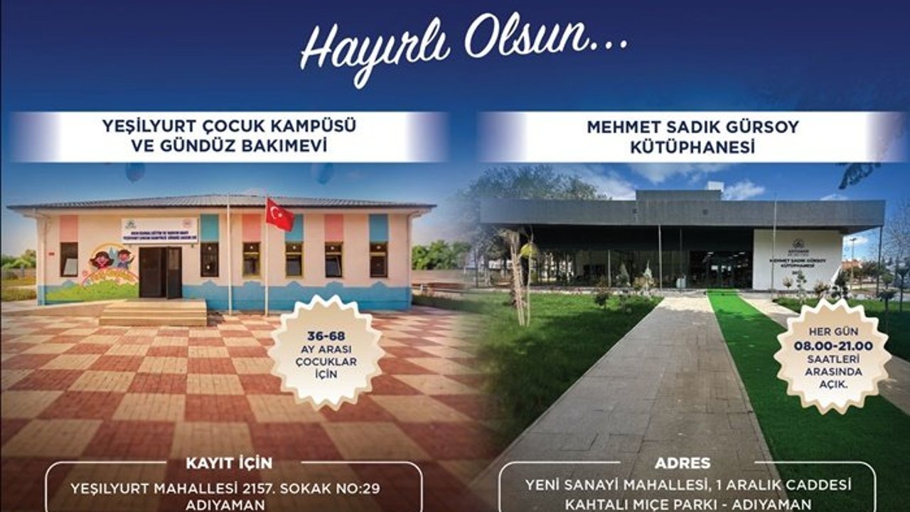 Adıyaman belediye başkanı Av.Abdurrahman Tutdere, Yeşilyurt çocuk kampusu, Gündüz bakımevi ve Mehmet Sadık Gürsoy kütüphanesi hizmetlerini Adıyamanlılara müjdeledi.