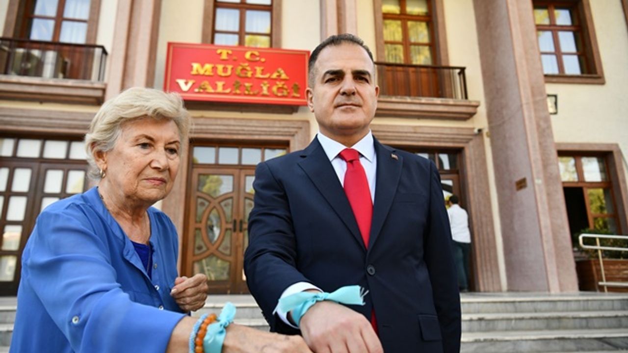 Gülser Özesen, Valimiz Sayın Dr. İdris Akbıyık’ın bileğine, Küresel Sumud Filosu'na desteğin sembolü olan “Turkuaz Kurdele”yi taktı.
