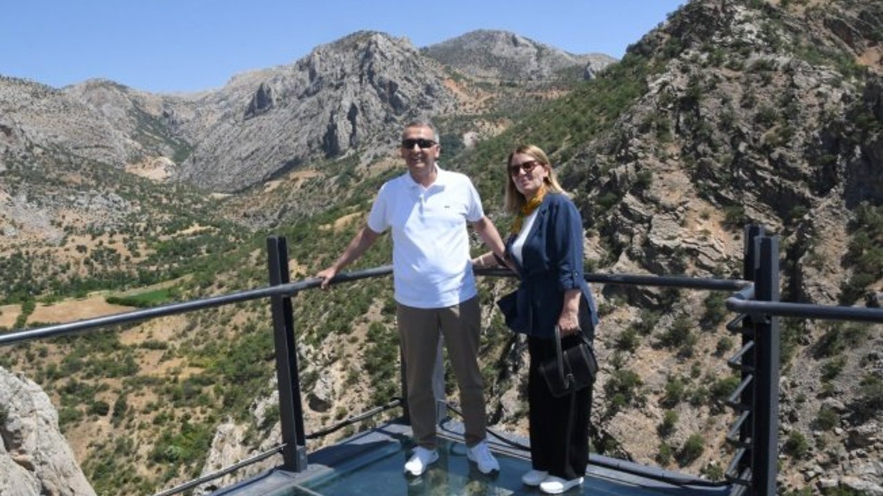 Restorasyon çalışmaları tamamlanan ve adrenalin tutkunları için cam terası yapılan Eski Kâhta Kalesini eşi Serinay Çuhadar ve Kâhta Kaymakamı Selami Korkutata ile birlikte gezen Vali Mahmut Çuhadar, yapılan cam teras ve restorasyon çalışmaları hakkında bilgi aldı.