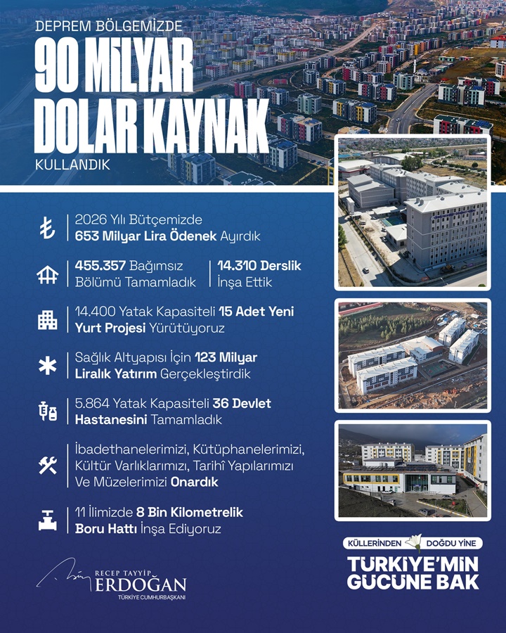 Bugün itibarıyla 455 bin konut, işyeri ve köy evi hak sahiplerine teslim edilmiştir. Bu; enkazın içinden umudu büyüten, güçlü devlet iradesinin açık göstergesidir.